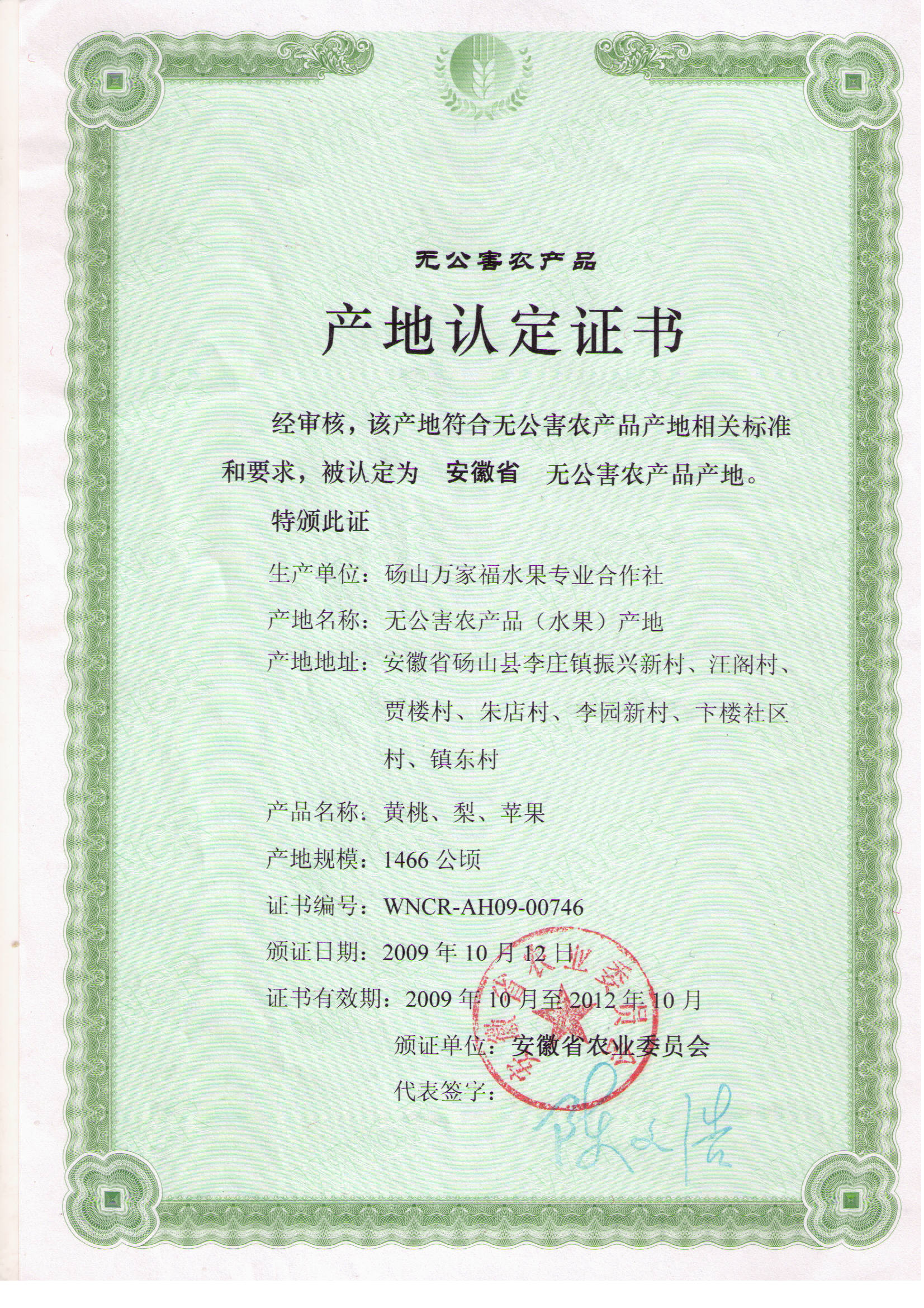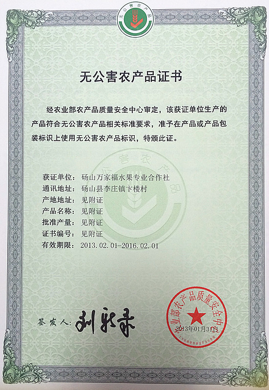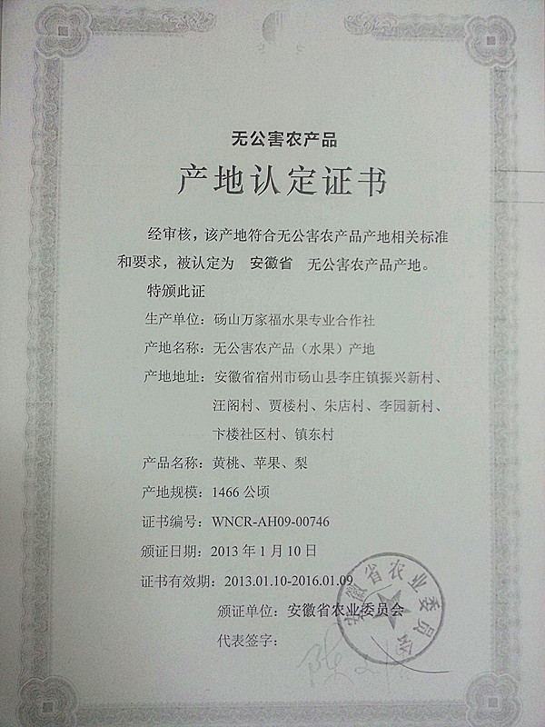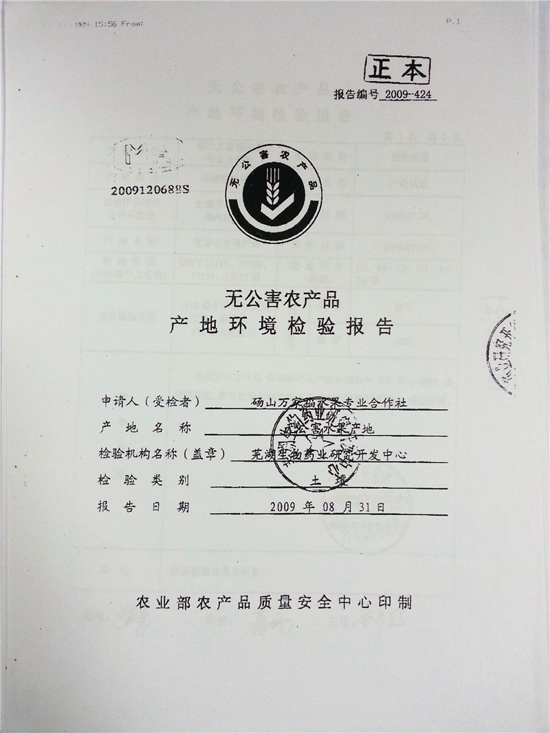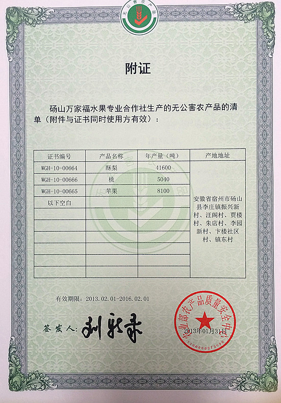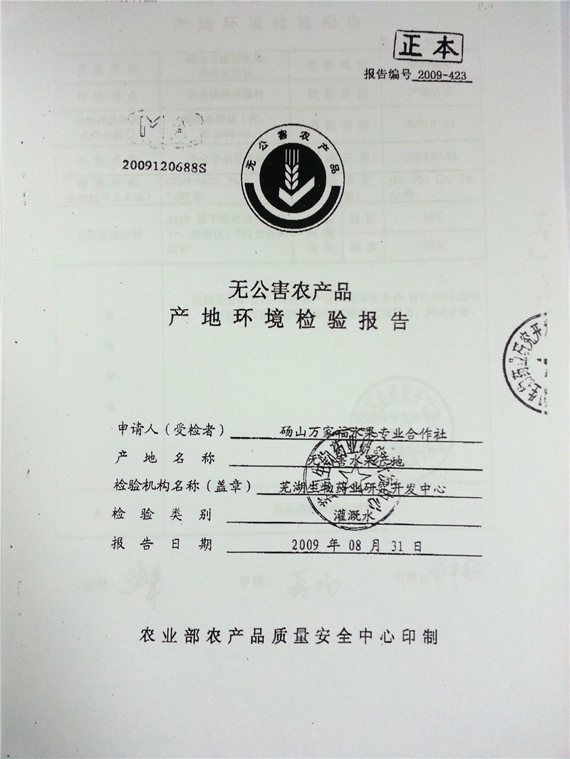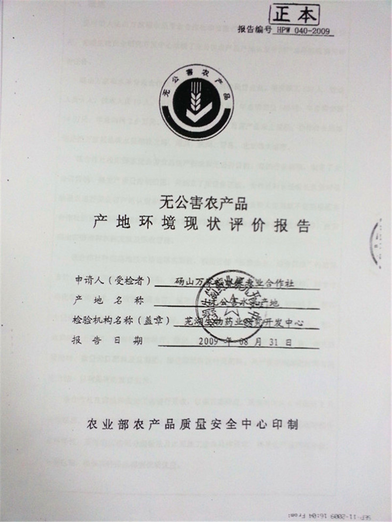 无公害认证编号:WGH-10-00664认证机构:农业部农产品质量安全中心 认证时间:2013-02-01有效期限:三年 无公害认证编号:WNCR-AH09-00746认证机构:安徽省农业委员会 认证时间:2009-10-12 |