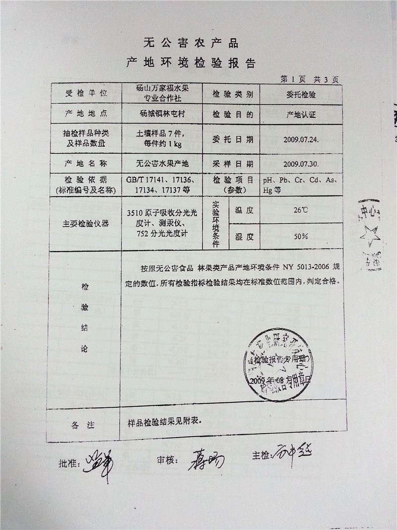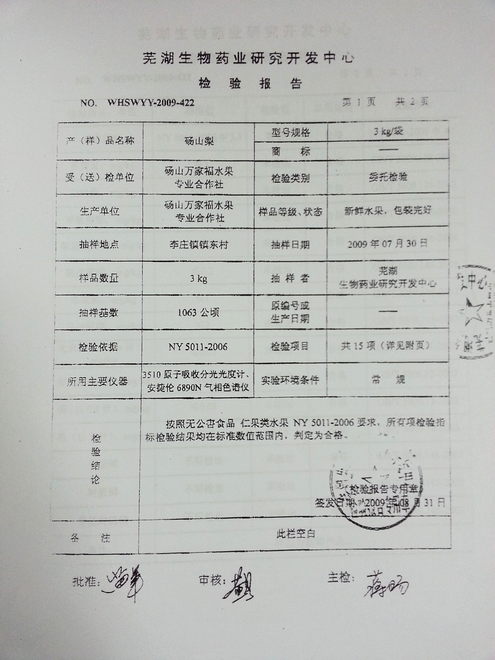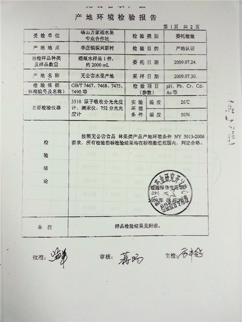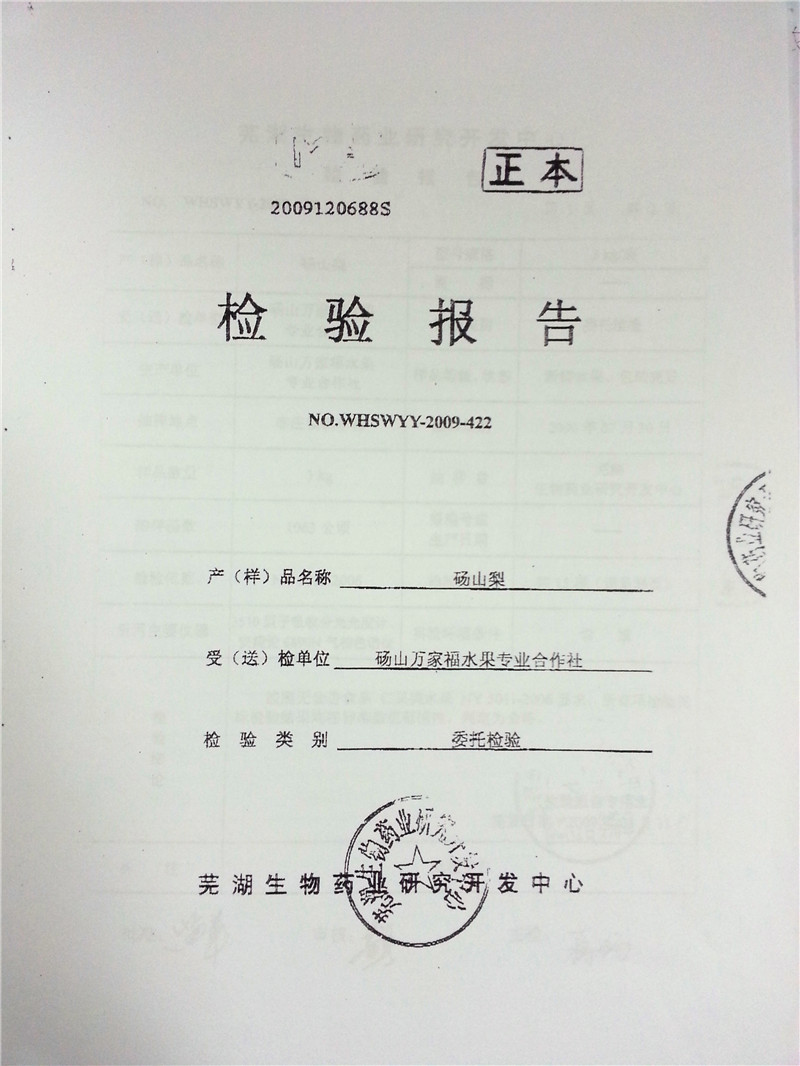 砀山梨检验报告检验单位:芜湖生物药业研究开发中心 检验数据:按照无公害食品 仁果类水果NY5011-2006要求,所有项检验指标检验结果均在标准数值范围内,判定为合格。 |
