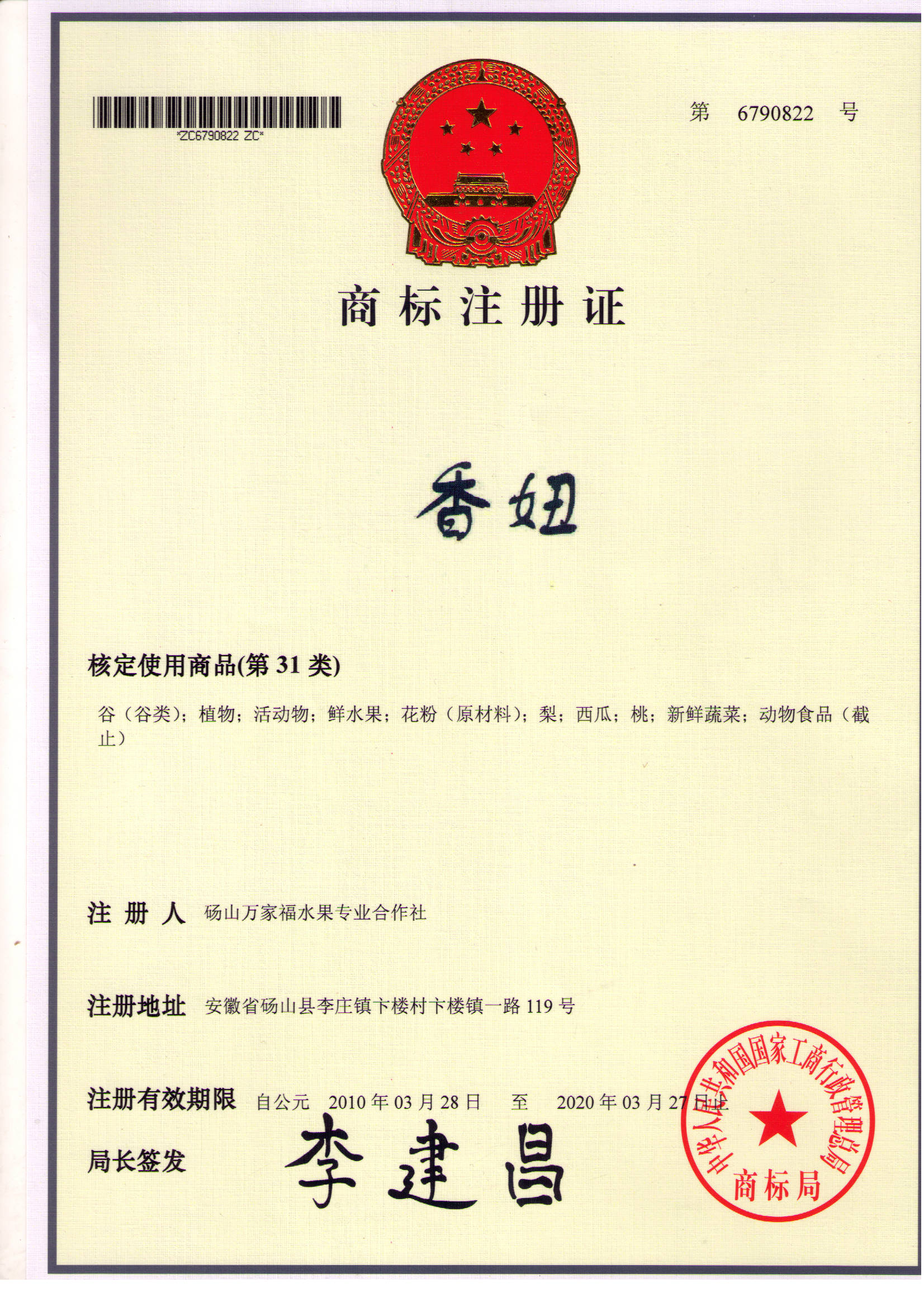 万家福商标类型: 商品商标商标注册号:6790821 通过时间:2010-03-28 香妞商标类型: 商品商标商标注册号:6790822 通过时间:2010-03-28 |